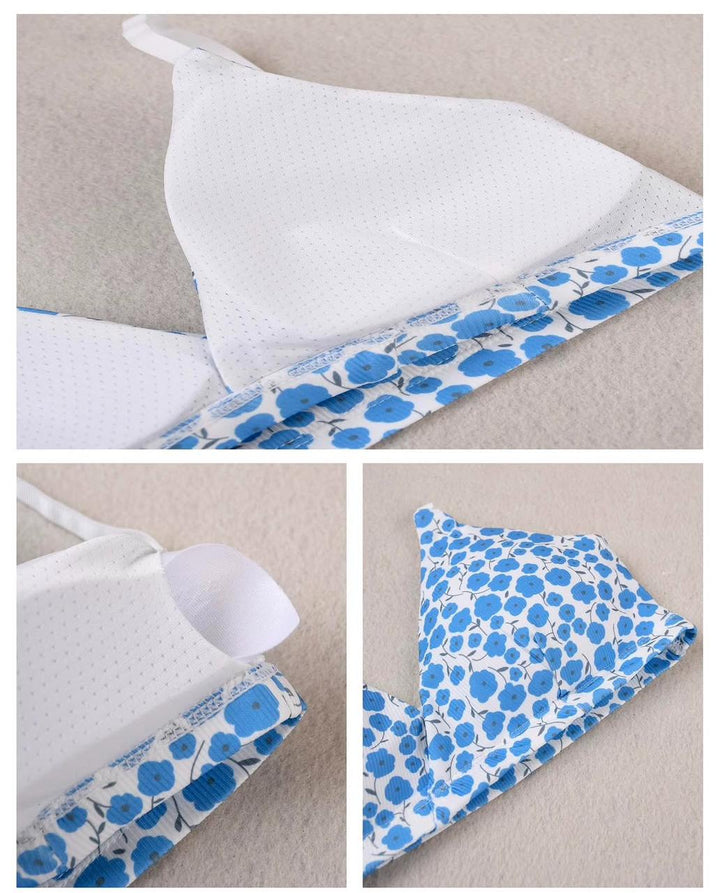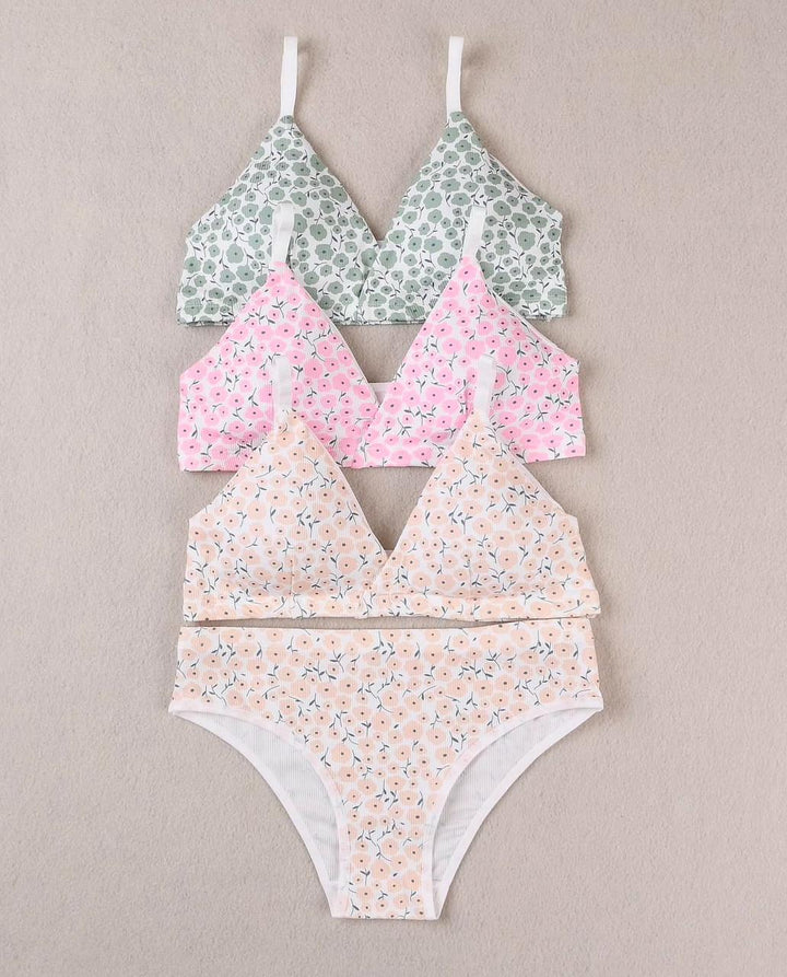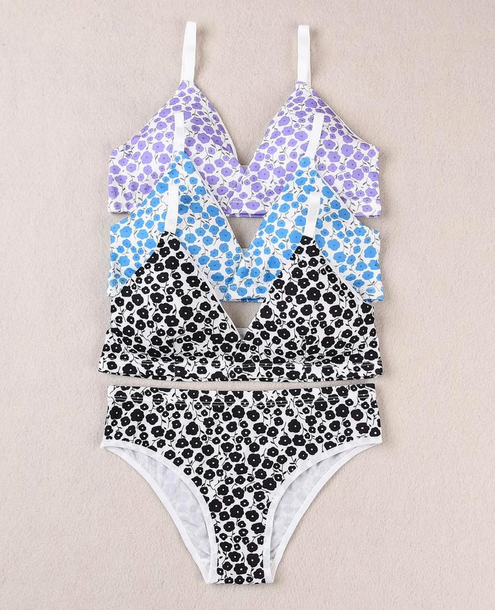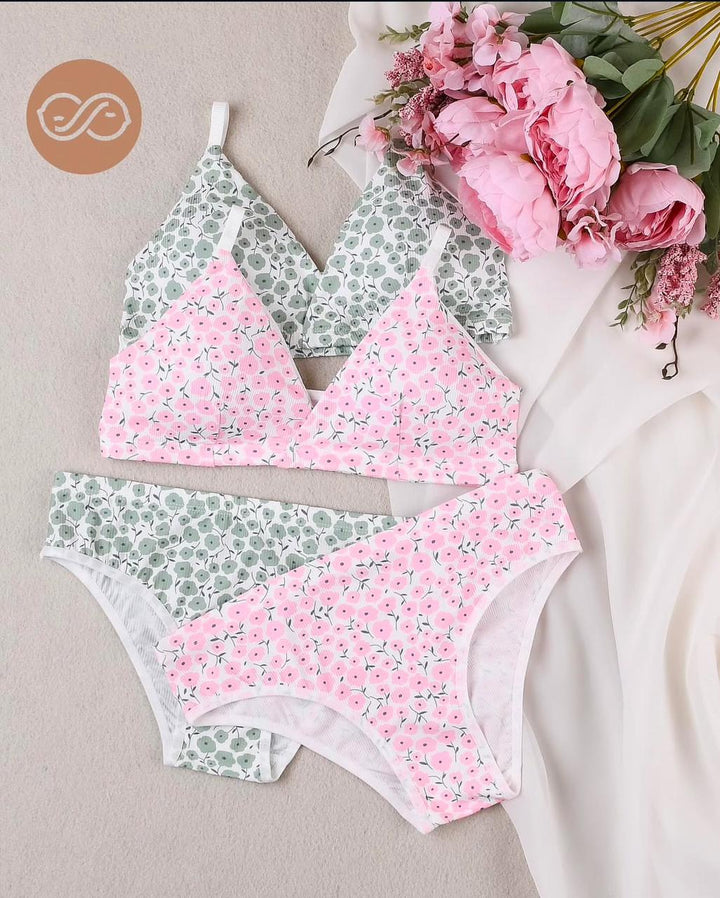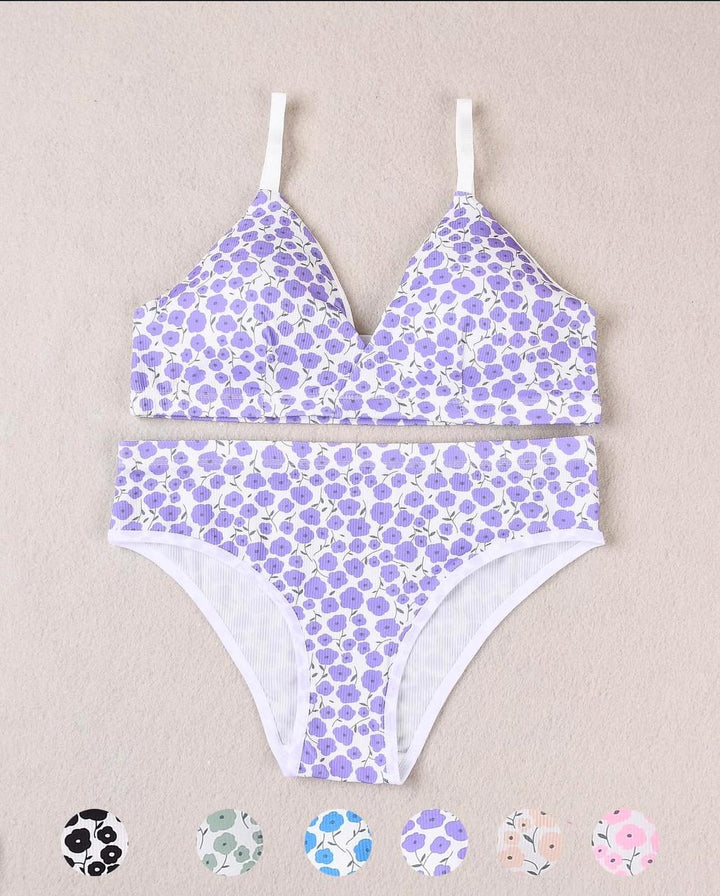 This delightful intimate set features a whimsical floral pattern of small, light-colored blossoms with tiny green leaves. The bralette has a comfortable triangle shape with slender, adjustable straps, offering light support and a natural silhouette. The matching panty is a classic brief cut, ensuring comfortable coverage. Made from a soft, stretchable ribbed fabric, this set combines playful design with ultimate comfort, making it ideal for lounging or a relaxed day.