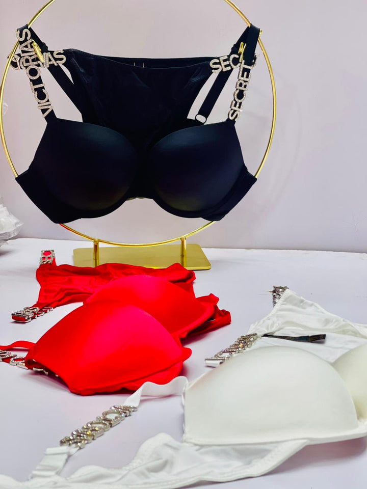 This eye-catching intimate set comes in a striking color, perfect for making a bold statement. The bra features smooth, padded cups for shaping and lift, ensuring a sleek silhouette. The standout elements are the adjustable straps and the underband of the thong, which are adorned with shimmering rhinestones spelling out "Victoria's Secret," adding a luxurious and eye-catching detail. The matching thong completes the set with coordinating fabric and the signature embellished logo band. This set is designed for those who want to feel both comfortable and exceptionally glamorous.